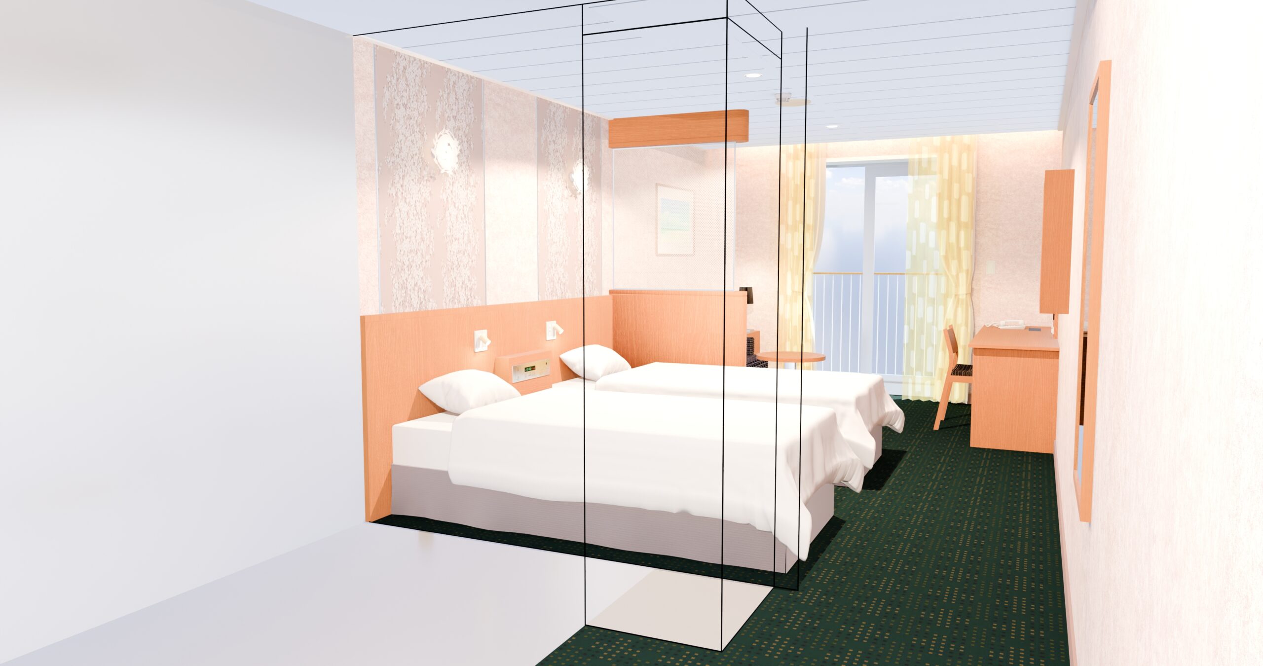 専用テラス、バス・トイレ付きのツインのお部屋です。海風を感じながら、ゆったりと船旅をお楽しみください。
