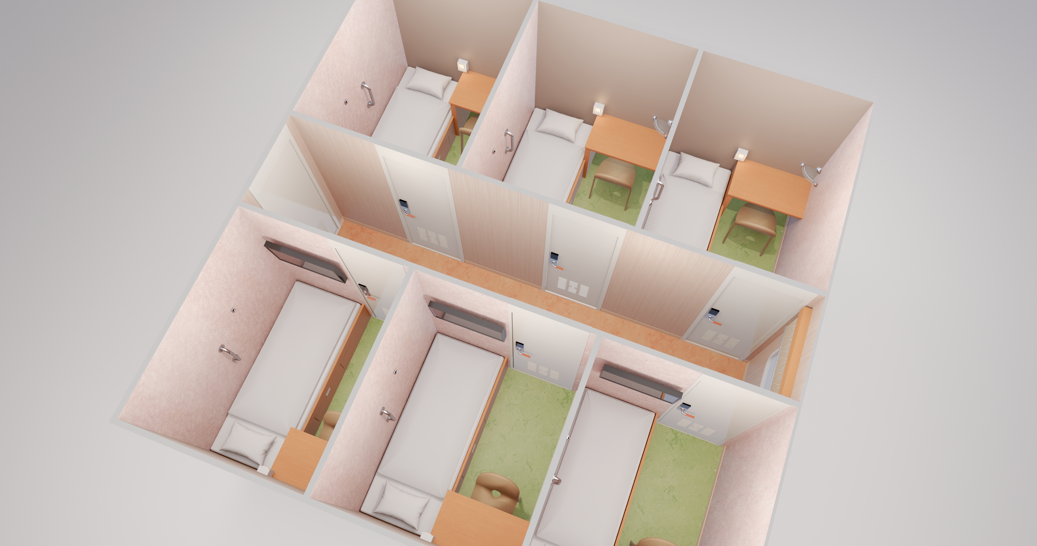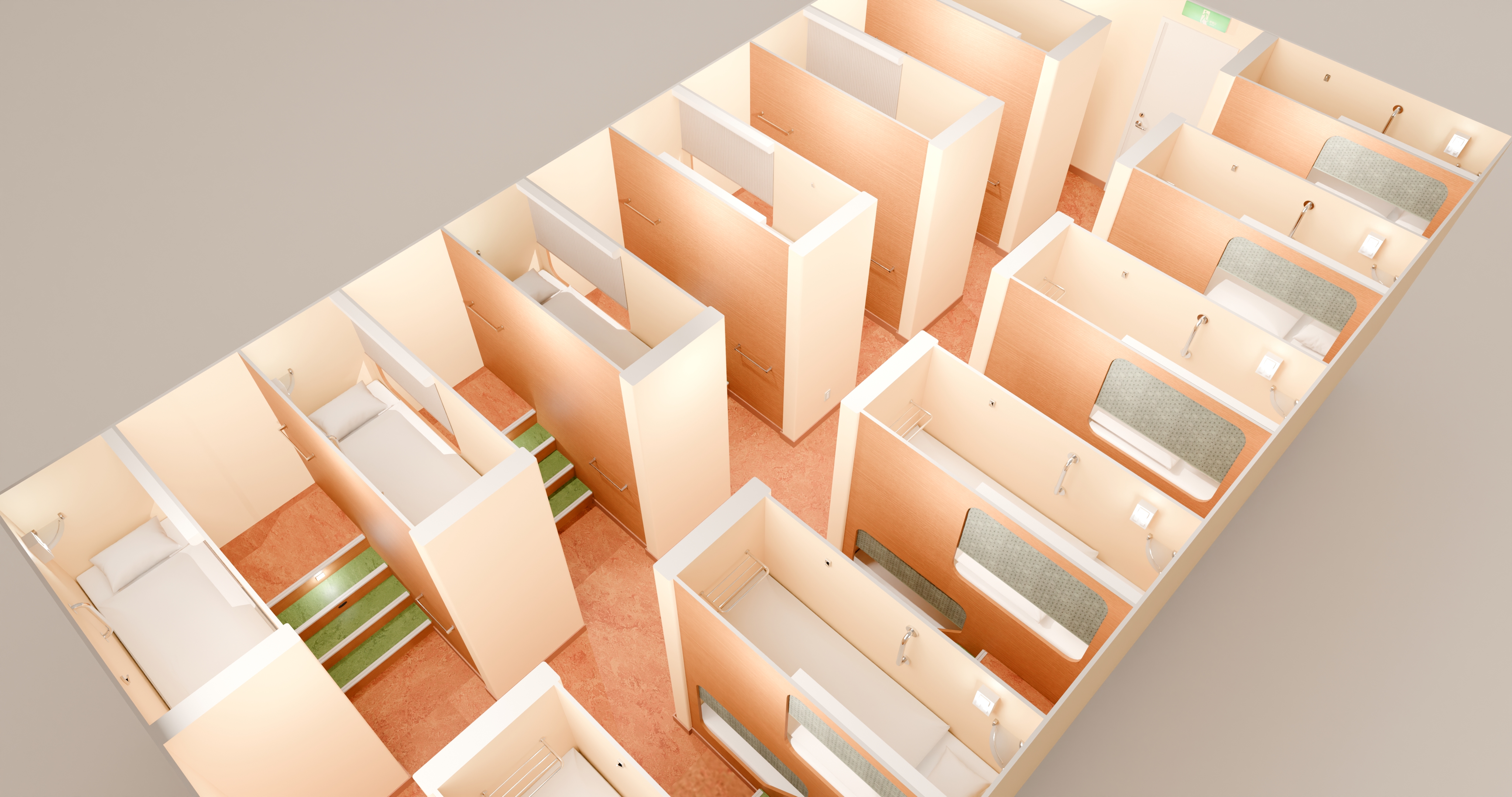 おひとり様1ベッド。対面式は下段と上段が互い違いの入り口になっていて、プライベート空間も確保。ご家族やグループにおすすめです。