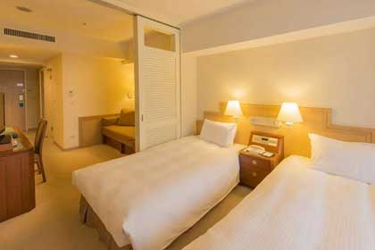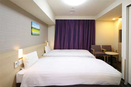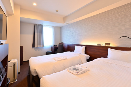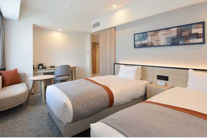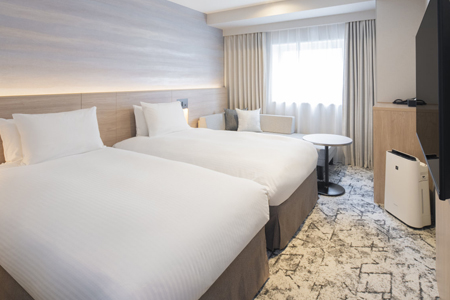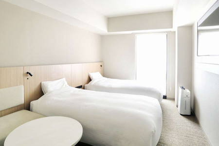 スタンダードでも20平米あり、ツインルームを主体とした温かく落ち着きのあるお部屋。加湿機能付空気清浄機を完備しています。