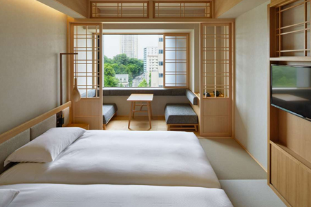 全182室の客室は、木のぬくもりを感じる和の空間。全室が靴を脱いで部屋に入るスタイルでのびのびとくつろげます。