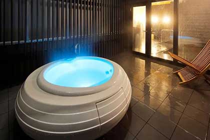 御影石を利用したオアシス空間には、広々とした主浴槽やジェットバスがあり男女別のサウナや水風呂も完備。女湯には露天風呂もあります。