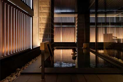 プライベート感を大切に落ち着いた空間としてデザインされた大浴場。シャンプーバーも人気